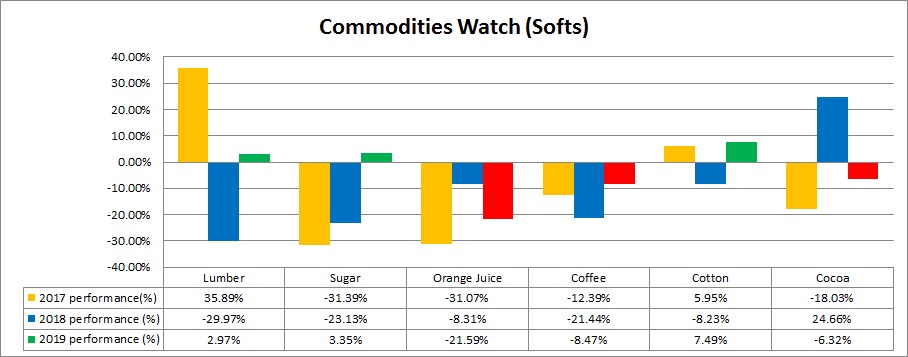 - The worst performer of the pack was Lumber (-30 percent), followed by Sugar (-23.1 percent), Coffee (-21.4 percent), Orange juice (-8.3 percent), and Cotton (-8.2 percent).