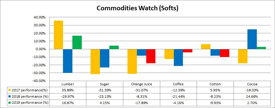As a whole, the Softs pack is down -1.4 percent in 2019. The pack is up 7.5 percent since our last review, a month ago.
