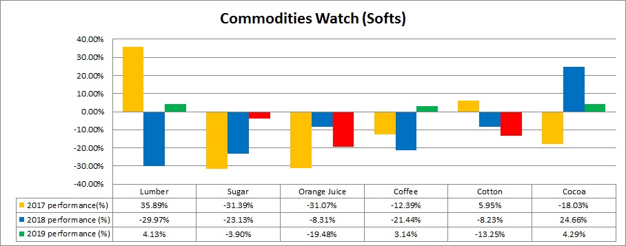 As a whole, the Softs pack is down -1.4 percent in 2019. The pack is up 7.5 percent since our last review, a month ago.