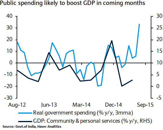 Government expenditure has risen sharply, led by a jump in both capital and revenue spending - central government expenditure (less interest payments) has risen 35% YoY which in turn contributed to healthy GDP growth. GDP grew 7.0% y/y in Q2 2015.