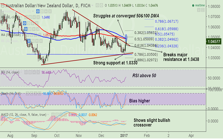 - AUD/NZD rejected at 1.0487, finds major resistance at 1.0485 which is converged 50&100 DMAs.