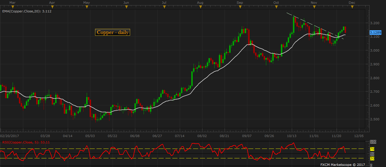 The copper price is correcting today after seven days of consecutive rise. Since finding support around $3.03 area two weeks ago, the price has risen steadily to reach as high as $3.174 area on last Friday. The chart clearly shows that short-term downtrend that began in mid-October was decisively broken last week as the price headed to test the October peak around $3.25 per pound.