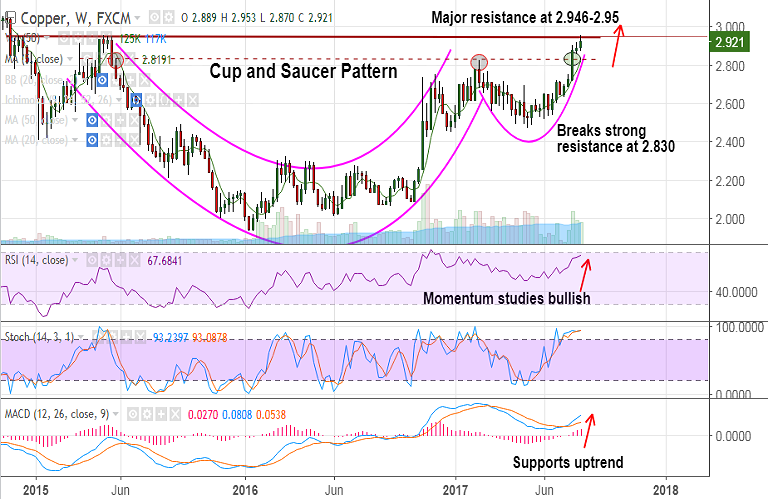 - The pair has broken strong resistance at 2.830 and is awaiting next leg higher after completing 'Cup & Saucer' pattern.