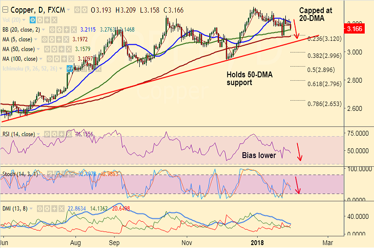 - Copper holds 50-DMA support at 3.157, weakness likely to accentuate on break below.