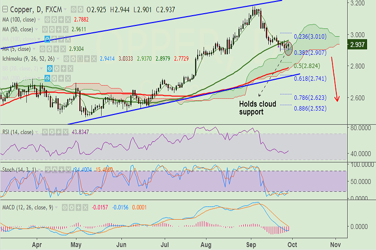 - Copper has bounced off cloud support and is currently hovering above 5-DMA at 2.9303.