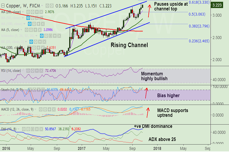 - Next major resistance lies at 3.285 (channel top) ahead of 3.293 (July 2014 highs) and then 3.335 (61.8% Fib of 4.20 to 1.936 fall).
