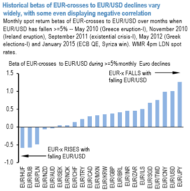 The above chart illustrates the point by plotting the historical spot return betas of EUR pairs to EURUSD during months of sharp Euro declines (defined as monthly EURUSD return <= -5%, constituting a 2 sigma fall). While concerted Euro-weakness can and does drag most of the bloc lower (mostly positive EUR betas), a handful of currencies – EURHUF, EURRUB, EURPLN, EURNZD and have all registered significant declines over the past few weeks
