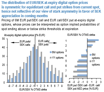 For instance, off spot ref: 9.6330, 6M 9.30 EUR put/SEK call vs. 9.70 EUR call/SEK put at-expiry digital risk-reversal has a net premium credit of more than 2% EUR. The short strike is above the YTD high, hence reasonable cushion against a backup in spot.