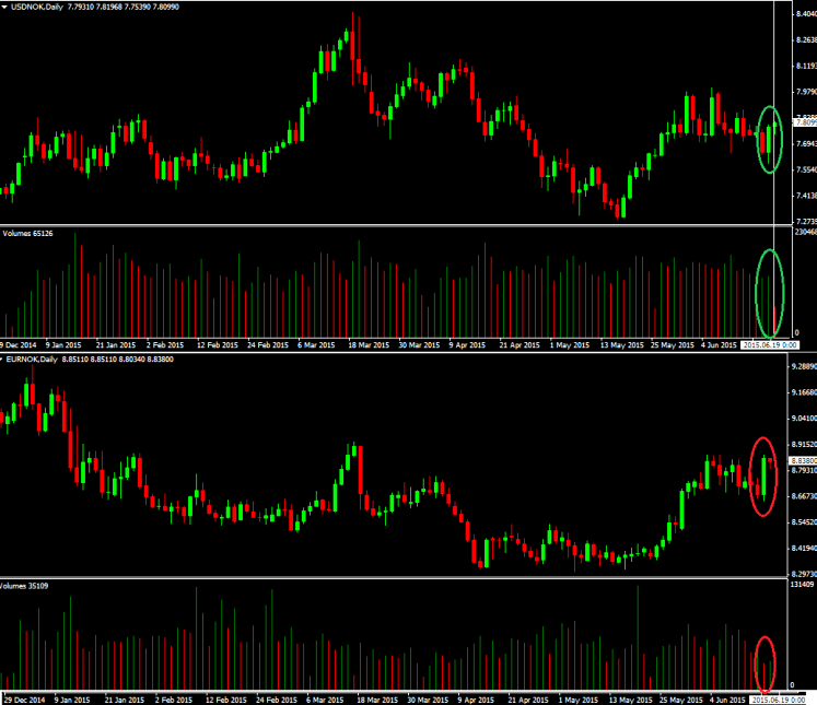 But volumes substantiated the bull momentum on USD/NOK but not EUR/NOK.