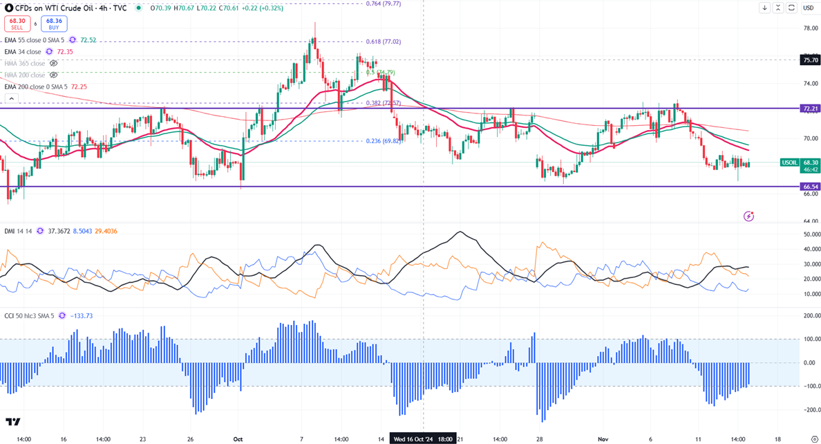 Near-term support is around $69.70; if this level is broken, targets could drop to $68.70/$68.45, $67, or $66. According to the 4-hour chart indicators, the ADX is bearish and the CCI is neutral at 50.