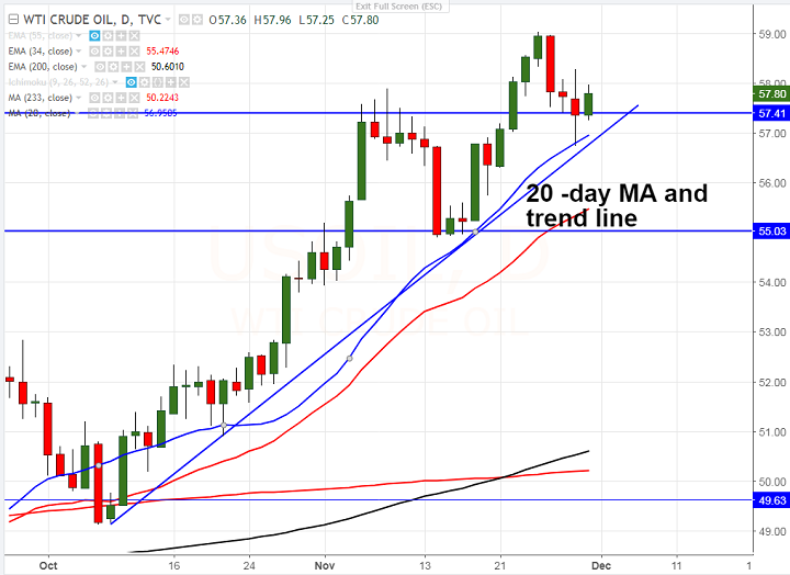 - US oil declined sharply yesterday till $56.74 and shown a minor increase from that level after OPEC meeting. OPEC agrees to extend its production cut to end of 2018.. The commodity recovered from intraday low of $57.25.