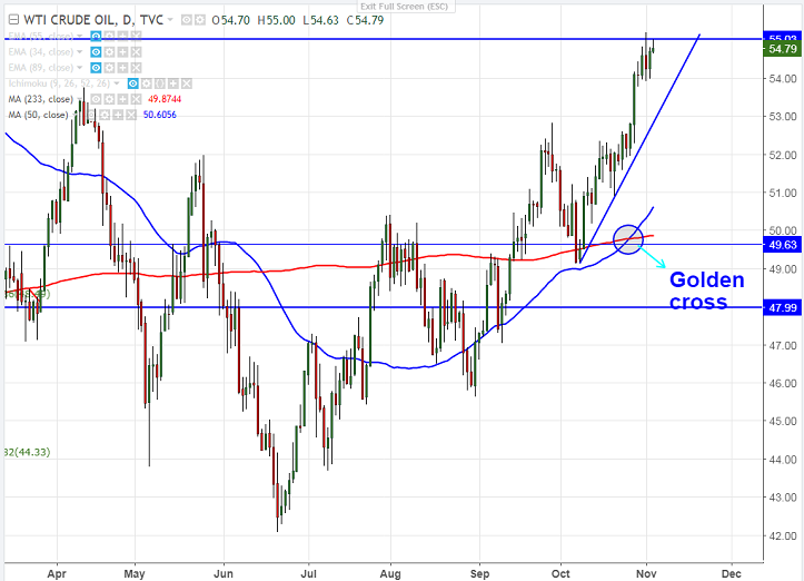 - Technically, WTI crude has formed golden cross (50 –day MA cross 233- day MA) and this confirms minor bullishness and jump till $58/$60. The near term major resistance is around $55.20.