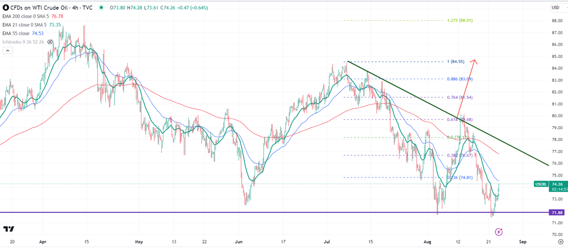 Crude oil showed a minor pullback after a massive sell-off. It hit a low of $71.49 at the time of writing and is currently trading around $74.