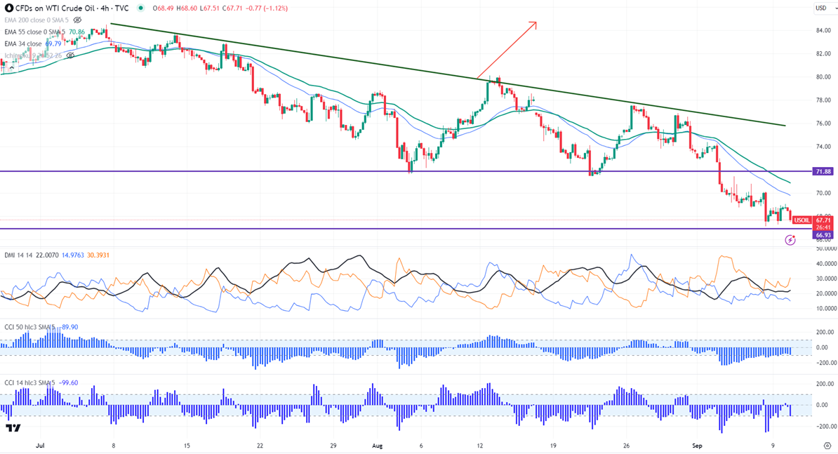 Crude oil trades below $70 on demand concerns. It hit a low of $67.13 and is currently trading around $68.42.