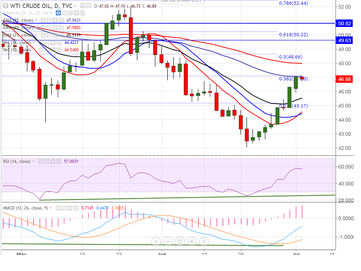 - On the lower side, major near term support is around $45.30 (21- EMA) and any brealk below wll drag the commodity down till $44.50 ( 10- MA)/$43.