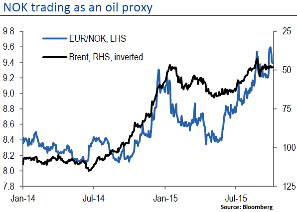 Providing support to domestic growth though is Norway's fiscal rule and the translational effect of a weaker NOK on Norway's sovereign oil fund, GPFG, that act as an automatic stabilizer. We can observe from the diagram how this currency cross is directly proportional to the oil prices.