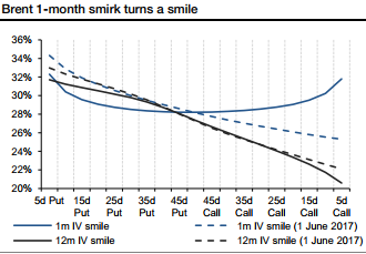 Lower levels of upside/downside ratios suggest higher hedging costs in the form of greater forgone upside potential. This implied cost has decreased significantly since the December 2016 OPEC meeting (upside/downside ratio rising from approximately 0.60 times to 0.90 times between December and June), in line with the general decrease of long-dated put skewness (refer chart evidencing risk reversals).