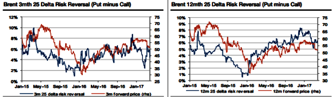 The Brent risk-reversals have over recent years made major trend reversals ahead of the Brent oil price: the 3mth risk-reversal peaked in early 2015 which was a few months before the Brent price; it bottomed in late 2014 which was again few months ahead of the oil price and the risk-reversal peaked in late 2016 which was well ahead of the recent sharp sell-off in crude oil prices.