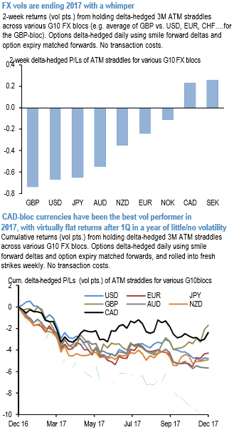 Yet CAD implied vols have not re-priced in any meaningful fashion to reflect this delivery: USDCAD 3M ATMs are up only 0.2 vols over the past month, crosses such as EURCAD (+0.5) and CADJPY (-0.2) have not fared a whole lot better. Part of this inertia probably reflects seasonal year-end vol softness, but if this state of affairs persists even after markets return in the New Year when both interest rate and trade talks pick up renewed steam, it should be an opportunity to pick up cheap volatility.