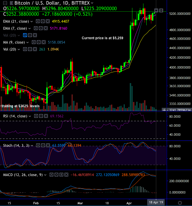 Please be noted that the BTC pricing against the dollar at the same two different exchanges, BTCUSD at Bitfinex and BTCUSD at Bittrex. There exists a disparity in their respective prices $5285 at Bitfinex and $5259 at Bittrex. Thereby, buying Bitcoin on the Bittrex exchange with USD and transferring the bitcoin and converting it back into USD on Bitfinex likely to derive a profit of just over 0.50%.