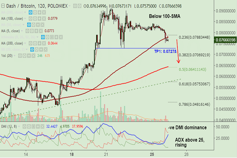 - DASH/BTC below 2H 100 SMA at 0.0779, intraday bias lower.