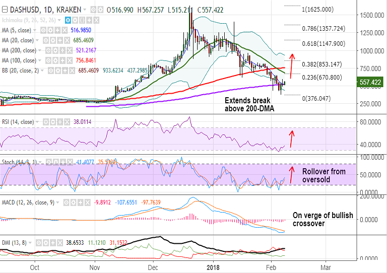 - DASH/USD extends bounce from 3-month lows at 376 levels, edges above 200-DMA.