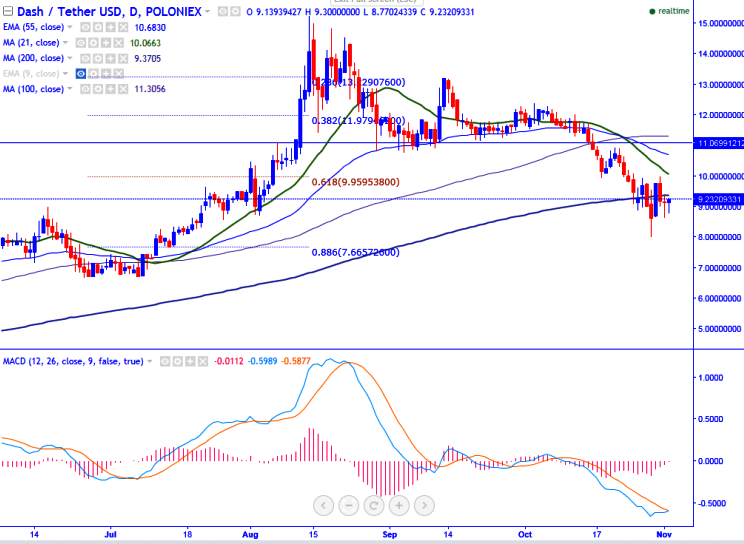 DASH/USDT jumped slightly after hitting the low of USDT8.64 (Poloniex). It is currently trading around USD9.23 at the time of writing.