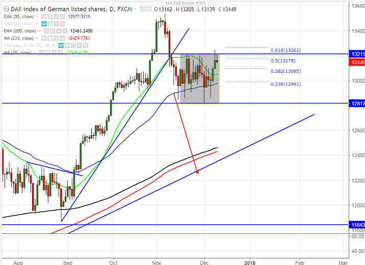 - DAX is consolidating in narrow range after hitting low of 12811 on Dec 1st 2017. The index hits fresh 2-1/2 years high at 13534 at Nov 7th 2017 and declining from that level. The index shown a minor recovery above 13200 and started to decline from the high. It is currently trading around 13144.