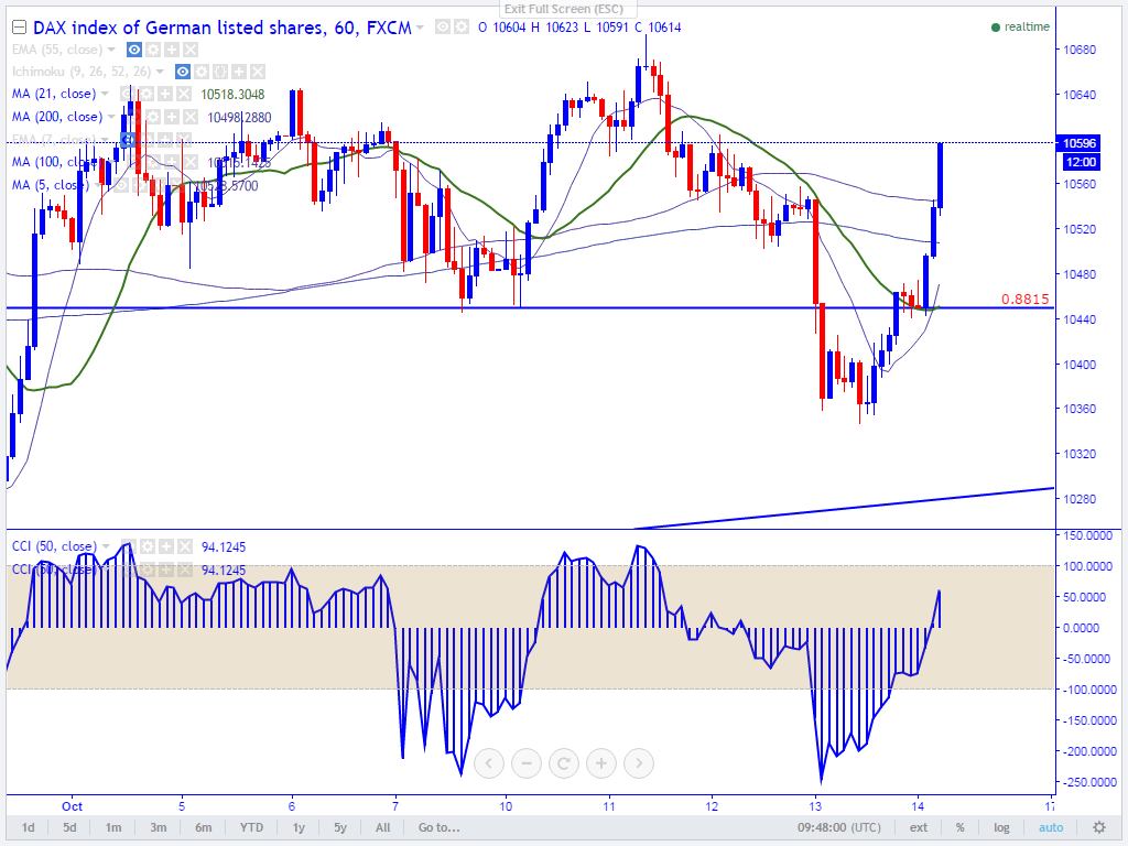 - In the hourly chart ,the index is trading well above Tenkan-Sen (10450) and Kijun-Sen (10461).It has also broken 200-HMA level (10515).Short term trend is slightly bullish, a jump till 10700/10806 is possible.