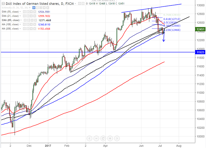 - DAX30 has formed a minor bottom around 12311 and recovered slightly from that level. The index made a minor jump till 12468 at the time of writing and is currently trading around 12456.
