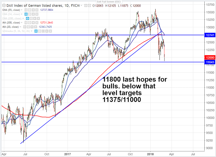 - DAX index has broken previous low of 11905 made on Feb 9th 2018 and declined till 11875. The index has formed a minor bottom at 11905 and showing a minor jump from that level.