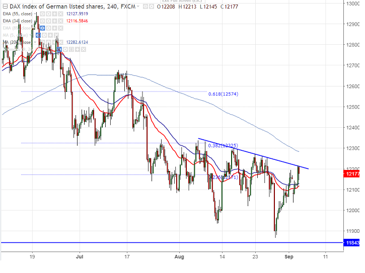 - The index has formed a minor bottom at 11867 and jumped slightly from that level. DAX jumped till 12292 and is currently trading around 12151.