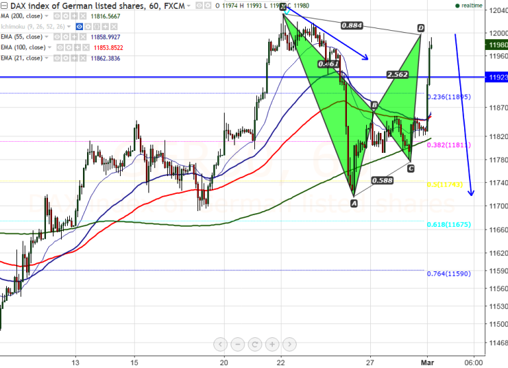 - DAX30 potential Bearish Bat pattern is expected to complete at 11997.Potential reversal zone is around 12035. Any violation above 12035 will take the index till 12165 (161.8% retracement of 11892 and 11463)/11231 (161.8% retracement of 12033 and 11463).