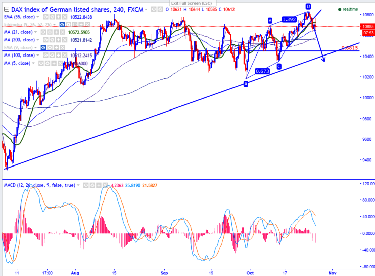 - DAX30 made a temporary top around 10830 and started to decline from that level. It is currently trading around 10732.