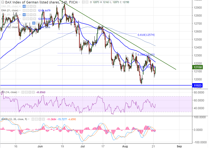 - The index is showing a minor jump after forming a bottom at 11936 on Aug 11th 2017. DAX jumped till 12292 and is currently trading around 12151.