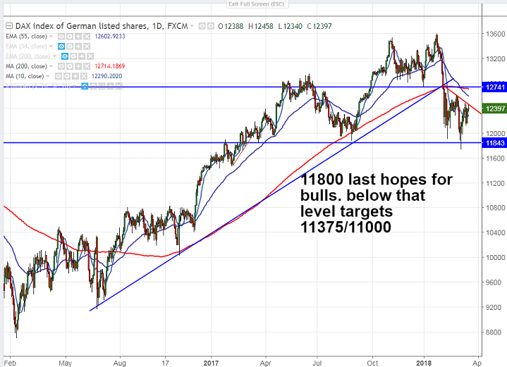 - DAX index was trading flat on Friday and closed at 12397 0.07% higher. US markets was trading mixed with Dow jones showing a minor jump and closed at 24873 (0.29% higher) and S&P500 was trading flat at 2752 (0.17% higher). Overall boarder market was flat and market eyes US fed monetary policy meeting on Wednesday. S&P500 futures is trading slightly lower and is at 2744 0.23% lower and traders eyes. Asian stock indices especially Nikkei is trading weak on strong yen.