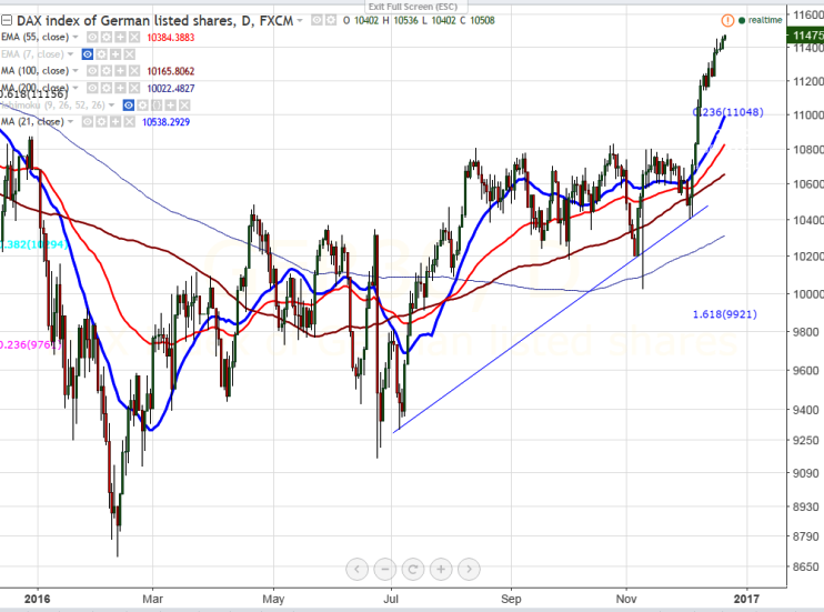 - The index is showing a continues upside for the past three trading session and is trading well above Nov 2015 high.DAX30 jumped till 11475 at the time of writing and is currently trading around 11473.