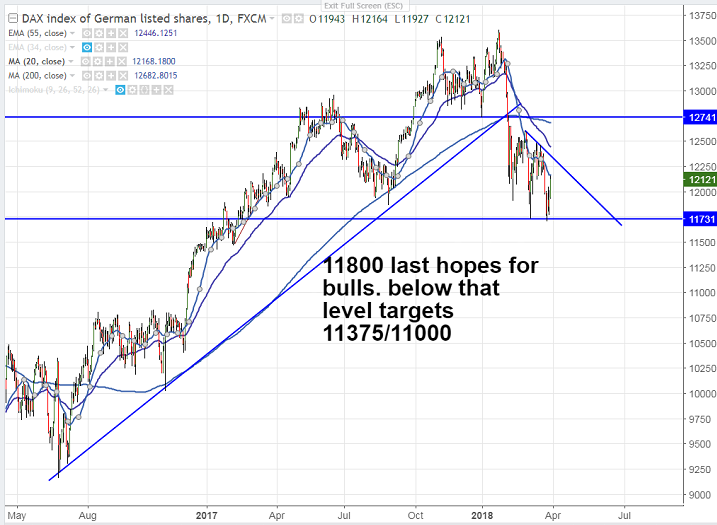 - DAX index inched higher after a forming a minor bottom around 11703. The index recovered sharply on Mar 29th 2018 and jumped almost 1.49%. US indices S&P 500 and Dow jones has taken support near 200- day MA and shown a good jump. S&P500 futures is trading flat after a more than 1% jump on Thursday and is trading around 2639 0.07% higher. Asian stock indices trading higher mainly Chinese market despite tariffs against U.S.