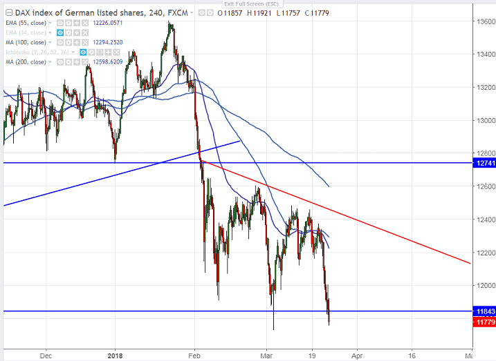 . - DAX index has broken major psychological support 11800 and any minor bullishness can be seen only above 12603 high made on Feb 26th 2018. The index should close above 200- day MA at 12707 for further bullishness.