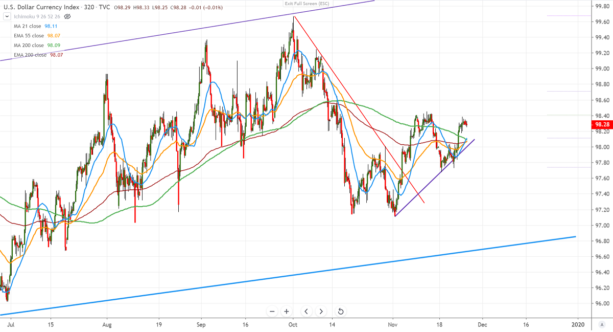 DXY is consolidating after hitting a high of 98.40 level and the overall trend is still bullish on US-China trade optimism. Wall Street stocks are trading upside and hit a fresh all-time high on increasing demand for riskier assets. Fed chairman was optimistic about the economy and said that that central bank is 'strongly committed' to 2% inflation. This shows that the chance of rate cut in the coming months is less. DXY hits an intraday low of 98.26 and is currently trading around 98.26.