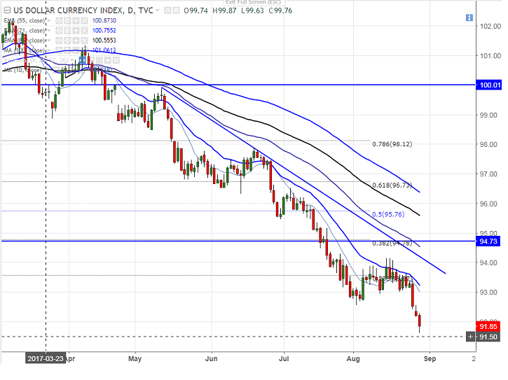 - US Dollar index has broken major support at 92.55 low made on Aug 2nd 2017 and declined sharply till 91.62 at the time of writing. It is currently trading around 91.82.