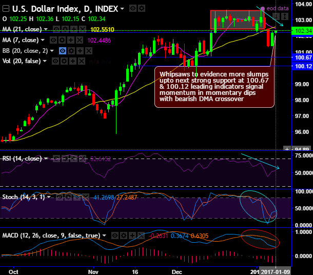 Although the dollar has been gaining its strength from the last two days against a basket of six other major currency peers, short-term trend seems a bit weaker as you could probably make out from the US dollar index dipping from the recent highs of 103.82 levels to head towards next immediate strong supports at 100.67 levels, not far from the recent lows of 99.43, its lowest level since December 08th.