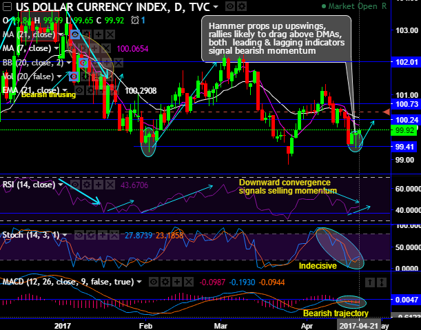 The US dollar index forms hammer pattern candlestick at 99.84 levels, historically, the bulls test the support at the same levels and the same bullish pattern has occurred to the evidence the upswings upto the peaks of 102.26 levels (refer daily charts).