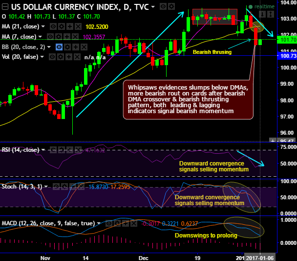 The dollar has been losing its strength from the last couple of days against a basket of six other major currency peers, as you could probably make out from the US dollar index dipping from the recent highs of 103.82 levels to head towards next immediate strong supports at 100.73 levels, not far from the recent lows of 99.43, its lowest level since December 08th.