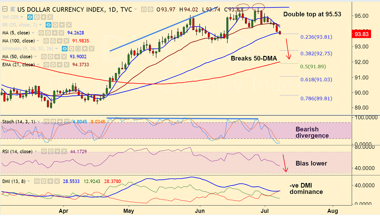 - The index has broken below 50-DMA at 93.90 and is currently hovering around 23.6% Fib at 83.81.
