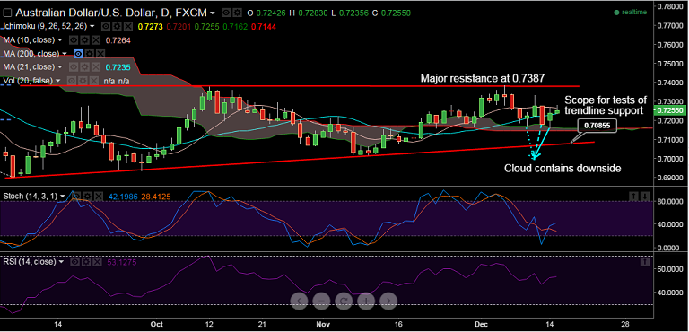 - AUD/USD slide from 0.7385 highs hit on Dec 4th is seen cushioned by cloud top (currently at 0.7162) on multiple occasions.