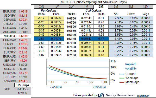 At spot reference: 0.6940, one can also deploy diagonal credit put spreads by writing 2w (1%) in the money put while initiating longs in 2m at the money put, the structure could be constructed at net credit.
