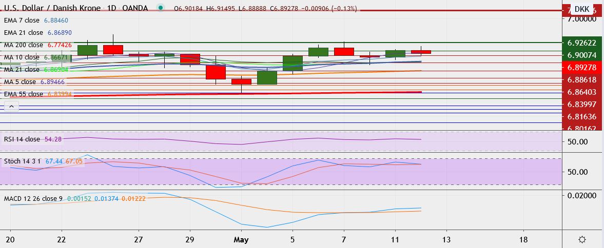 - USD/DKK is trading 0.1 percent down at 6.8932, having hit high of 6.9291 on Thursday, its highest since Apr. 24.