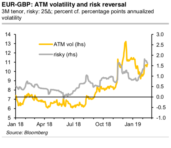 However, this strategy has recently become considerably more expensive (Refer above chart). Still, the GBP vol surface has not always accurately reflected the changing probability of a “no-deal” scenario. EURGBP optionality is expensive (particularly on the upper side) in comparison to summer 2018, but, from my vantage point, cheap in comparison to the no-deal risk. Courtesy: Commerzbank & Bloomberg
