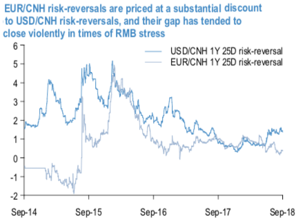 Needless to specify, there is also greater incentive to repeat the pattern this time around in light of the trade backdrop. How useful is EURCNH as a RMB weakness play? Using the sell-off in the currency since the first batch of tariffs in June as a guide, EURCNH rose 6% alongside the 9% trough-to- peak rally in USDCNH, so a beta of 0.7x. 1Y 25D EURCNH risk-reversals however priced at a paltry 0.35, much narrower than corresponding USDCNH riskies around 1.35 (refer above chart); per the graphic, this is not a large gap by historical standards, but it is also true that these gaps have tended to close rather violently in times of RMB stress. We suspect that much of the non-responsiveness of EURCNH skews this year owes to the above-average bid for EUR puts in general, reflecting the option market’s nervousness around the Italian budget. Such skittishness explains why other EUR/Asia risk-reversals are also priced near 5-yr tights (e.g. EURKRW). Courtesy: JPM